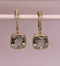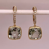 14k yellow gold green amethyst and diamond huggie style hoop earrings. 4.60ct.tw. cushion cut green amethysts dangle from the snap bar hoops accented with .12ct.tw. diamonds.
