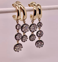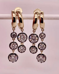 14k yellow gold lab diamond dangle earrings. Double huggie style 'J' hoop earrings with various sizes of lab diamonds dangling in rows from the hoops. Diamonds are of VS clarity, FG color and accented with black enameling. Posts with clutch backs. Total lab diamond weight: 3.30cts. 5.8gr.