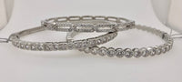 Bright silver finish. Round cubic zirconia. Open criss-cross pattern. Fits up to 7 1/2".