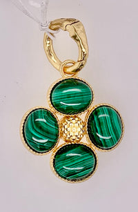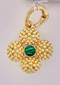 Add a beautiful token of luck to any chain to carry with you wherever you go. Our clover gold finish pendant is made with luminous orbs of malachite with intricately detailed golden accents and a gilded berry center. This ornate and elegant piece makes a fabulous gift for someone special (including yourself)! Length: 1 3/4".