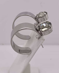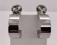 Dani Studded Hoop Earrings feature a rivoli round-cut crystal on a chunky metal hoop. Posts with clutch backs. Bright silver finish. Length: 1 1/4".