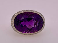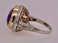 Spectacular 18k yellow/white gold two tone filigree design, bezel set 20x15mm amethyst surrounded by approximately 1.25ct. total weight diamonds.