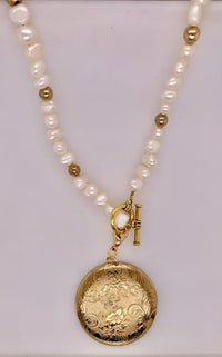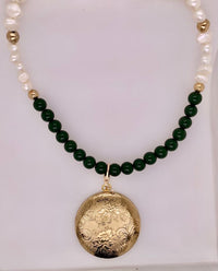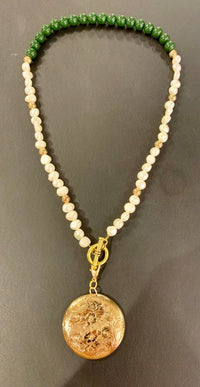 Fashion necklace containing vintage faux jade beads, freshwater pearls and gold-filled beads. The focal is made from an antique pocket watch case and can be clipped into the toggle clasp or centered in the faux jade beads. Length: 18".