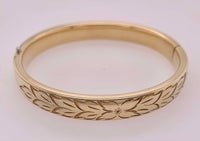 Gold filled vintage embossed bangle. Bar clasp. Width: 5/16". Fits up to 7 1/2" wrist.